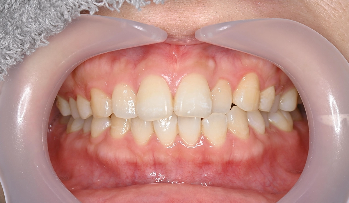 非抜歯での全顎矯正 治療前後の比較写真 Before After 患者様のお悩み 前歯の並びが気になるとのことで、当院にご来院されました。特に上下の前歯にガタつきがあり、「人前で笑うときに歯並びが気になる」「写真を撮るときに口元が気になる」とご相談いただきました。 比較写真から分かる変化 治療前は上下の前歯に軽度から中等度の叢生(歯の重なり)が見られましたが、治療後には前歯のガタつきが改善され、整った歯並びに仕上がっているのが分かるかと思います。 また、上下の歯の噛み合わせも適切に調整されています。 治療計画の立案 まずは口腔内写真、レントゲン撮影、デジタルスキャンなど、矯正治療に必要な精密検査を実施しました。 その結果、奥歯の噛み合わせは良好で、歯を並べるスペースを確保できれば、抜歯をせずに治療が可能であると診断しました。 患者様からは、「できれば健康な歯を抜きたくない」「仕事中も目立たない方法がいい」とのご要望があったため、以下の治療計画をご提案しました。 治療方針 IPR(歯と歯の間を少し削る処置)歯と歯の間を0.2〜0.5mm程度削り、歯を並べるスペースを確保 上顎臼歯の遠心移動奥歯を後方に移動させ、前歯を並べるスペースを作る 非抜歯での全顎矯正 使用装置 マウスピース型矯正装置(インビザライン) アライナー枚数:24ステージ(10日交換) 透明で目立ちにくいマウスピース矯正であれば、日常生活や仕事への影響を最小限に抑えられること、取り外しができるため衛生管理がしやすいことをご説明し、患者様にもご納得いただいたうえで治療を開始しました。 治療を終えての結果 治療期間は約8ヶ月で終了しました。前歯のガタつきが改善され、自然で整った歯並びに仕上がりました。 患者様からは「思っていたより早く終わった」「治療中も周りに気づかれなかった」「笑顔に自信が持てるようになった」と喜びの声をいただきました。 治療後は後戻りを防ぐため、リテーナー(保定装置)を装着していただいています。 担当歯科医師からの所感 今回のように、軽度から中等度の叢生で奥歯の噛み合わせに問題がない症例では、IPRと臼歯の遠心移動を組み合わせることで、抜歯をせずに治療できるケースが多くあります。 マウスピース型矯正装置は、目立ちにくく取り外しができるため、特に社会人の方や、日常生活への影響を最小限に抑えたい方に適した治療法です。 ただし、すべての症例に非抜歯矯正やマウスピース矯正が適応できるわけではありません。 骨格的な問題がある場合や、重度の叢生がある場合は、抜歯矯正やワイヤー矯正が必要になることもあります。 お口の状態をしっかりと診査・診断したうえで、患者様に最適な治療プランをご提案いたしますので、まずはお気軽にご相談ください。 治療の詳細 主訴 前歯の並びが気になる 年齢・性別 20代女性 症状 叢生(歯の重なり) 治療期間 8ヶ月 治療費 インビザライン治療費:880,000円検査費:33,000円リテーナー:33,000円合計:946,000円デンタルローンによるお支払いで、月々21,000円 治療内容 マウスピース型矯正装置による非抜歯矯正IPR、上顎臼歯遠心移動 使用装置 マウスピース型矯正装置(インビザライン)24ステージ(10日交換) リスク・副作用 痛み・治療後の後戻り・歯根吸収・歯髄壊死・歯肉退縮 マウスピース矯正を見る